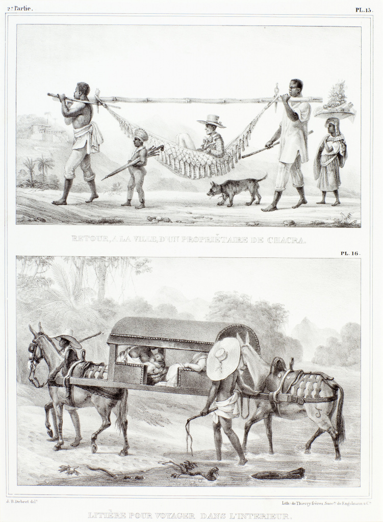 Acervo da Pinacoteca do Estado de São Paulo, Brasil. Coleção Brasiliana/ Fundação Estudar. Doação da Fundação Estudar, 2007 (acesso em https://www.brasilianaiconografica.art.br/artigos/24248/cadeirinha-de-arruar-um-simbolo-de-status-nas-ruas )Le St. viatique portè chez un malade / Transport d´un enfant blanc, pour être baptisé a l´église — 1839 — DESENHISTA Jean-Baptiste Debret — AUTOR Pauline de Portes