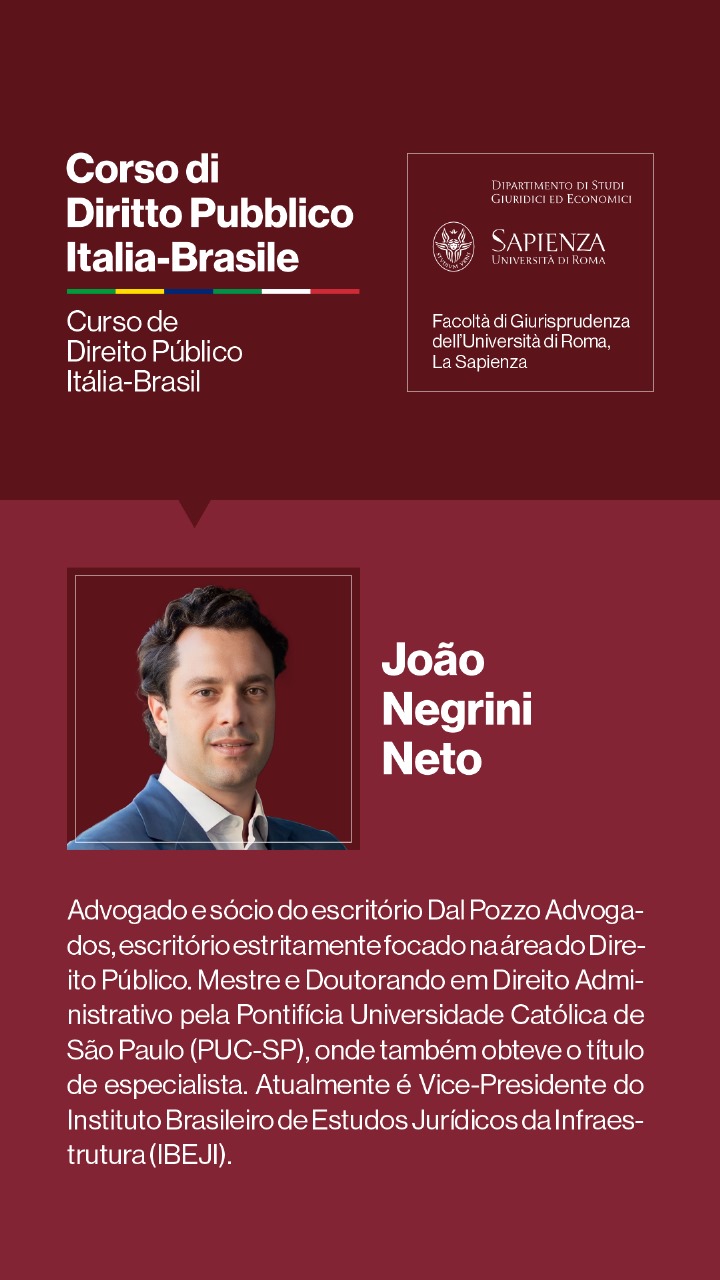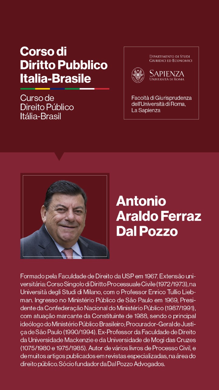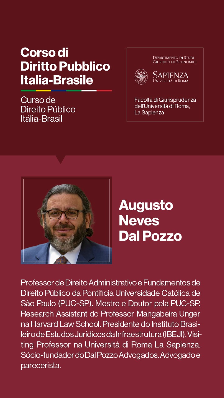 Para o Professor Augusto Dal Pozzo, trata-se de “oportunidade fantástica de nos reunirmos no oráculo do Direito, que a Università di Roma La Sapienza representa, debatendo temas relevantes para o futuro do direito público, em verdadeira cúpula de juristas, que abordarão os temas e adornarão o evento, de maneira transcendente, em experiência transformadora e de construção de memórias duradouras.”