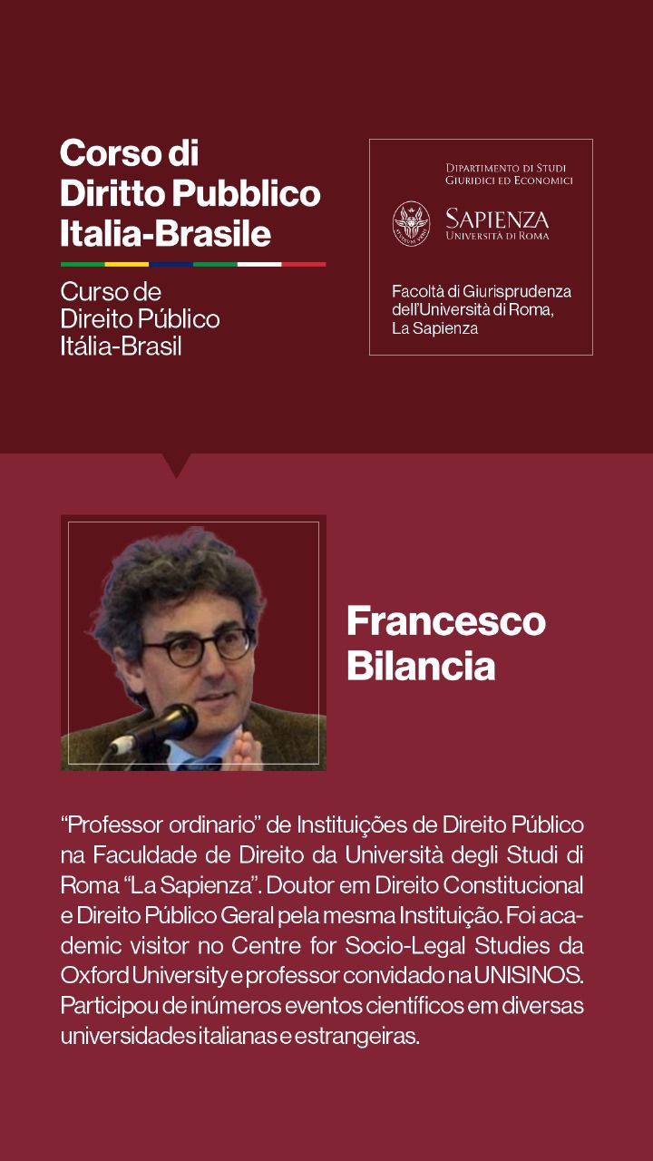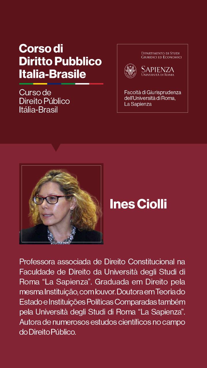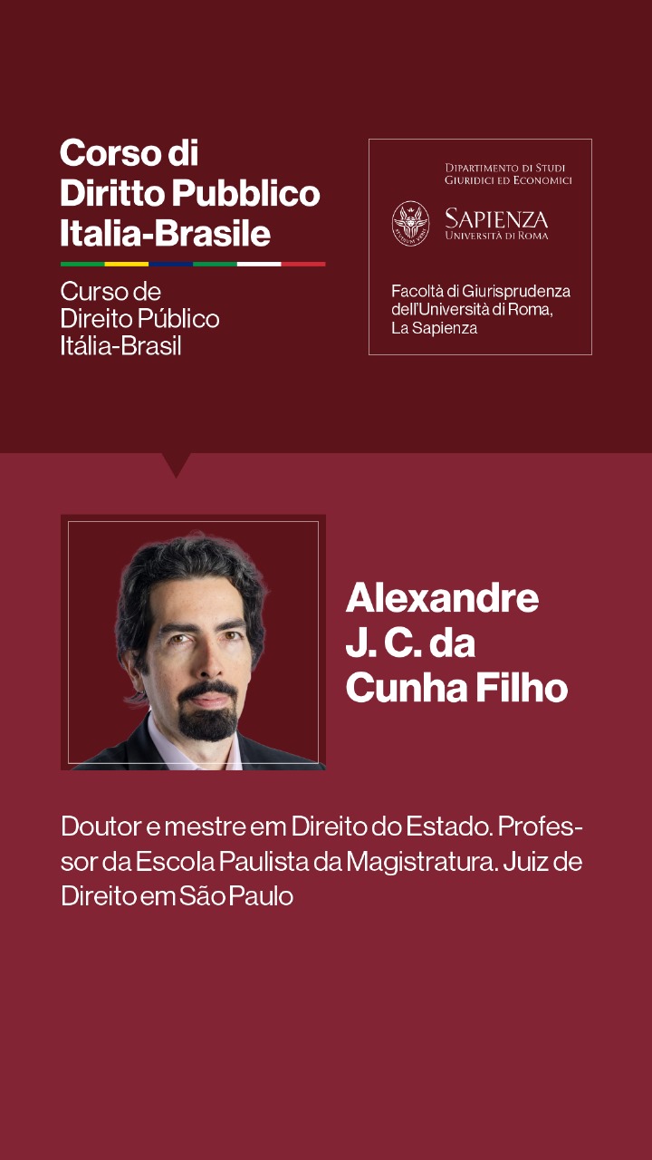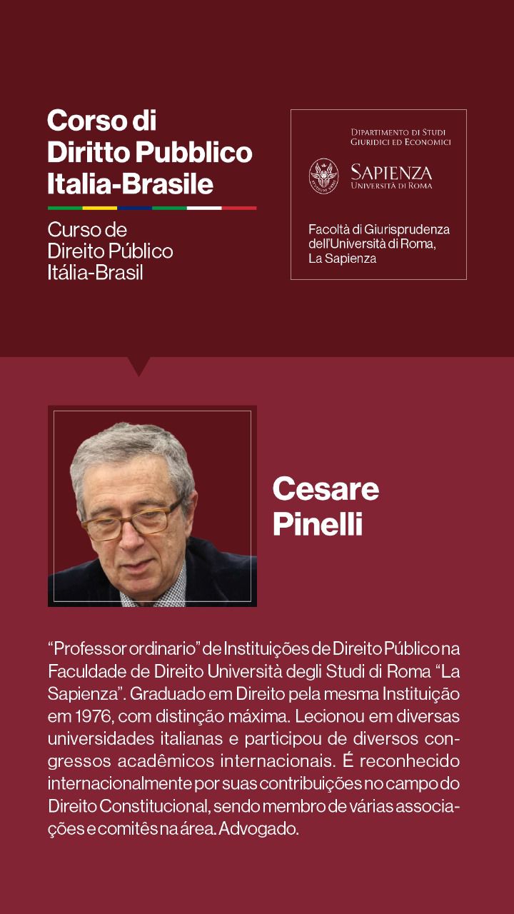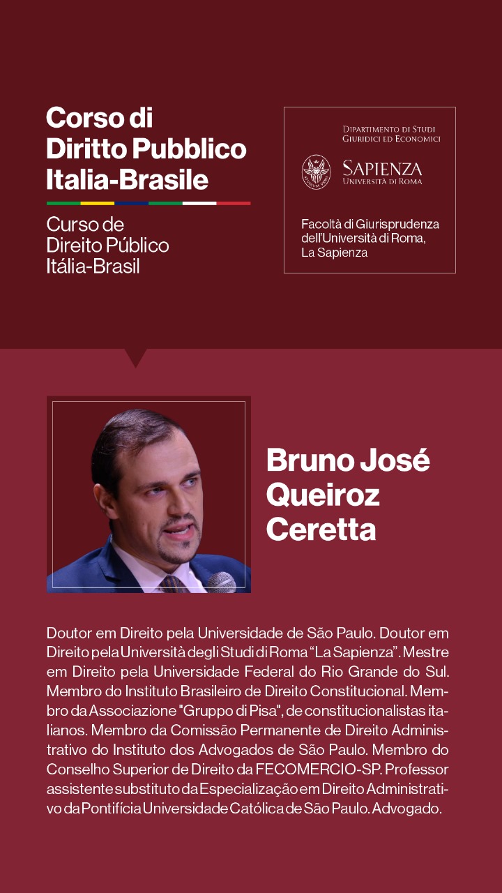Entre os dias 1º e 5 de julho de 2024, a Università degli Studi di Roma I — La Sapienza — e seu Dipartimento di Studi Giuridici ed Economici, realizarão, sob a coordenação dos Professores Doutores Augusto Neves Dal Pozzo e Bruno José Queiroz Ceretta, da Pontifícia Universidade Católica de São Paulo, e Ines Ciolli e Francesco Bilancia, da Università di Roma I, a Cúpula Roma de Direito Público Itália-Brasil — Cupola Roma di Diritto Pubblico Italia-Brasile — e o Curso de Direito Público Itália-Brasil: Jornadas Ítalo-Brasileiras de Estudo - Corso di Diritto Pubblico Italia-Brasile: Goirnate di Studio Italo-Brasiliane.