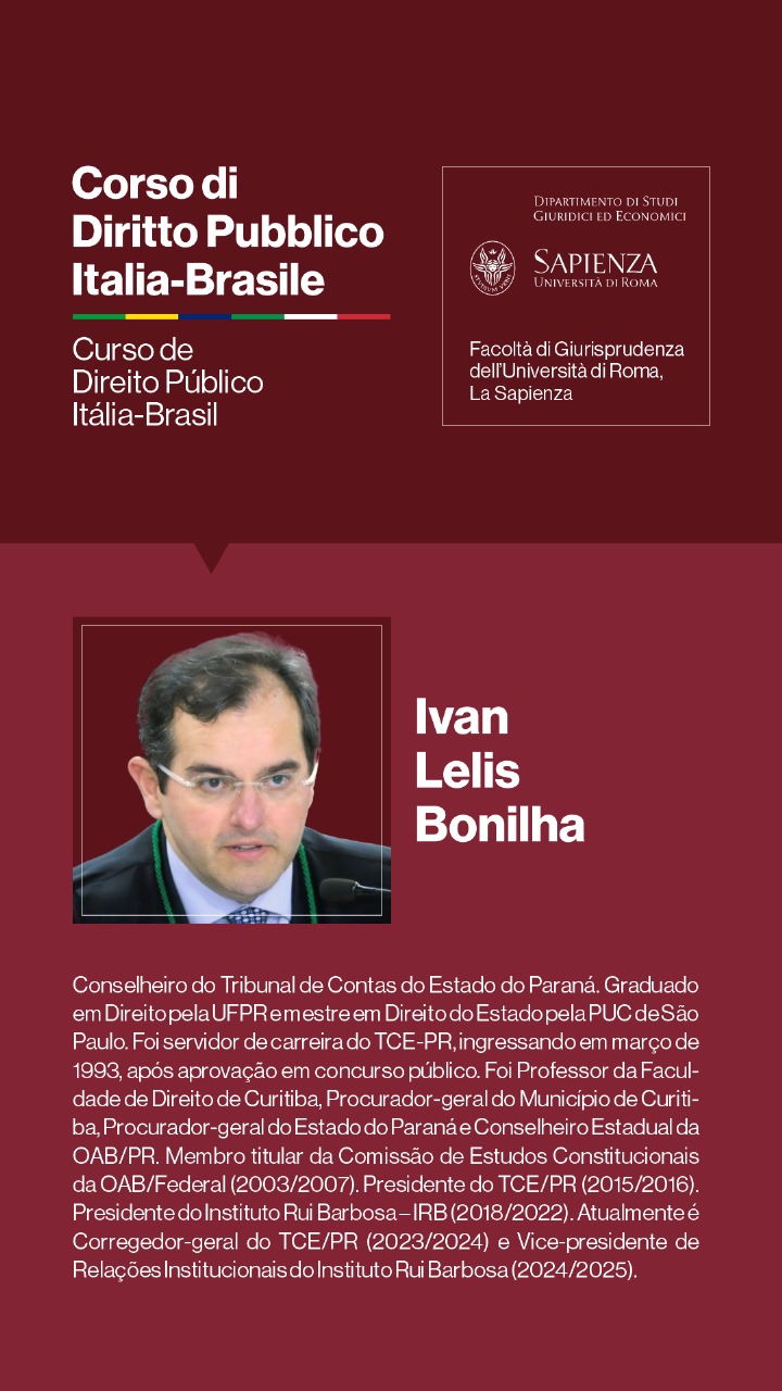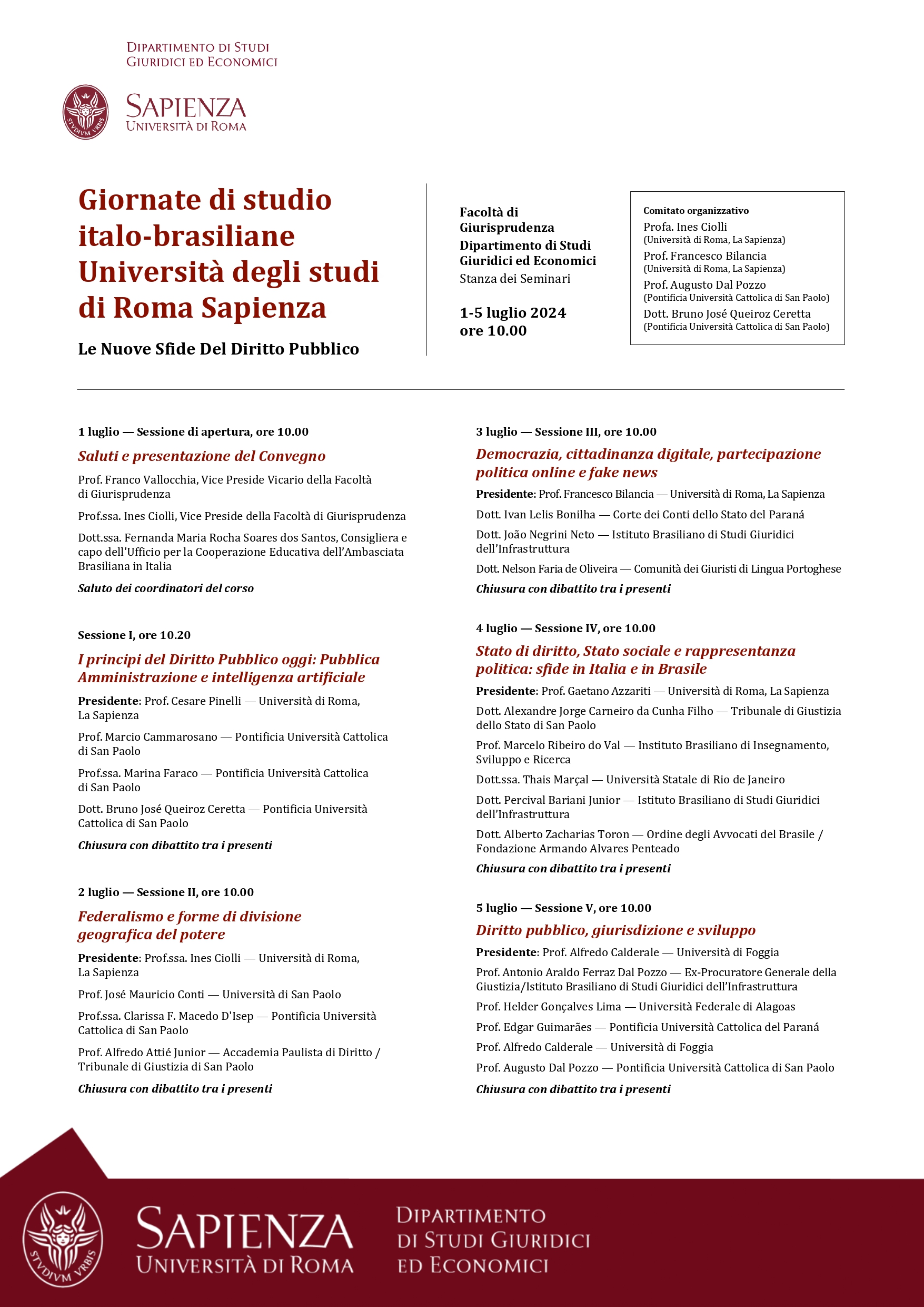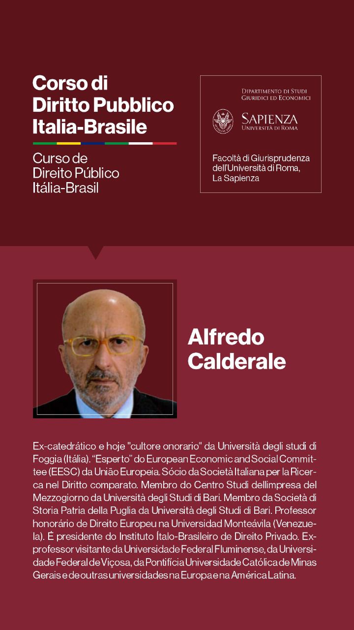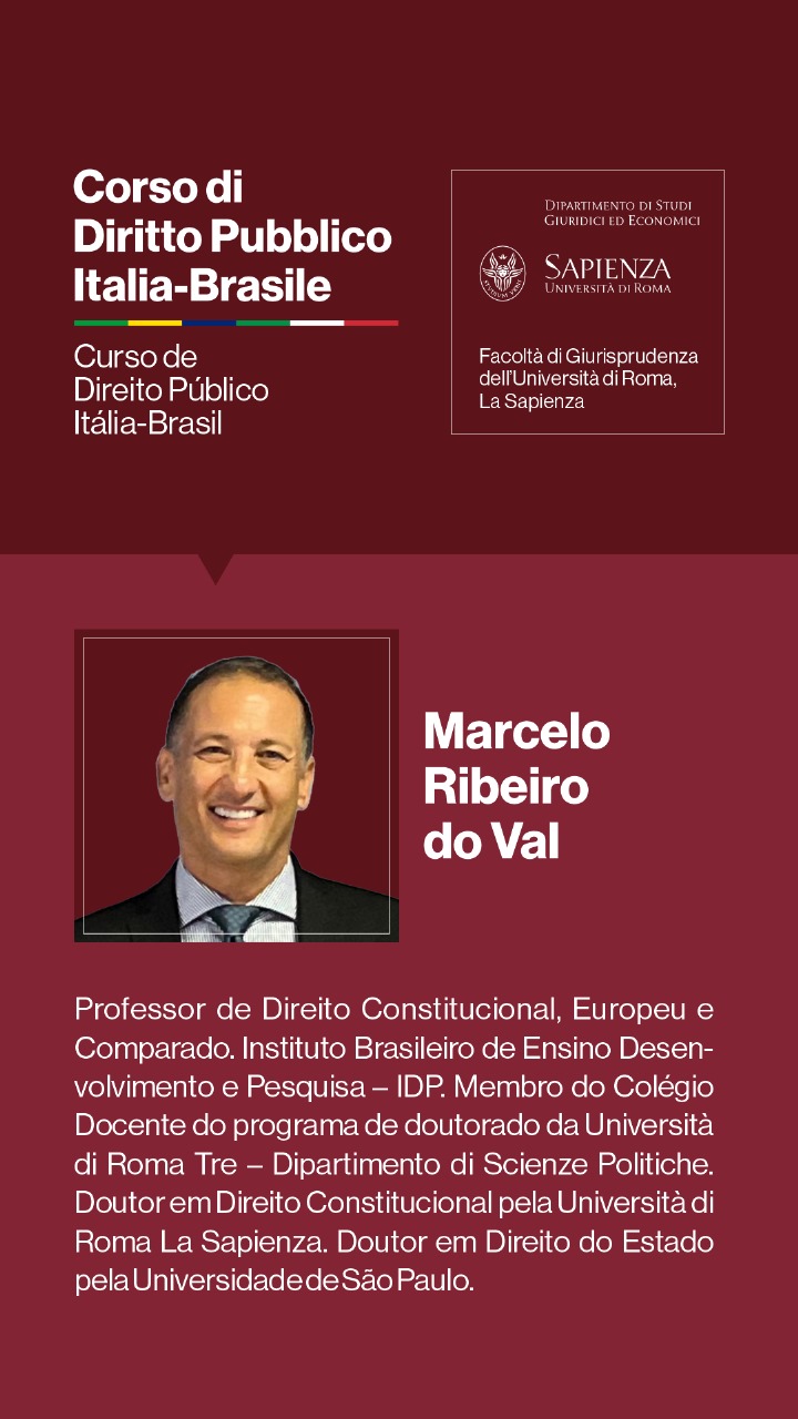 Entre os dias 1º e 5 de julho de 2024, a Università degli Studi di Roma I — La Sapienza — e seu Dipartimento di Studi Giuridici ed Economici, realizarão, sob a coordenação dos Professores Doutores Augusto Neves Dal Pozzo e Bruno José Queiroz Ceretta, da Pontifícia Universidade Católica de São Paulo, e Ines Ciolli e Francesco Bilancia, da Università di Roma I, a Cúpula Roma de Direito Público Itália-Brasil — Cupola Roma di Diritto Pubblico Italia-Brasile — e o Curso de Direito Público Itália-Brasil: Jornadas Ítalo-Brasileiras de Estudo - Corso di Diritto Pubblico Italia-Brasile: Goirnate di Studio Italo-Brasiliane.